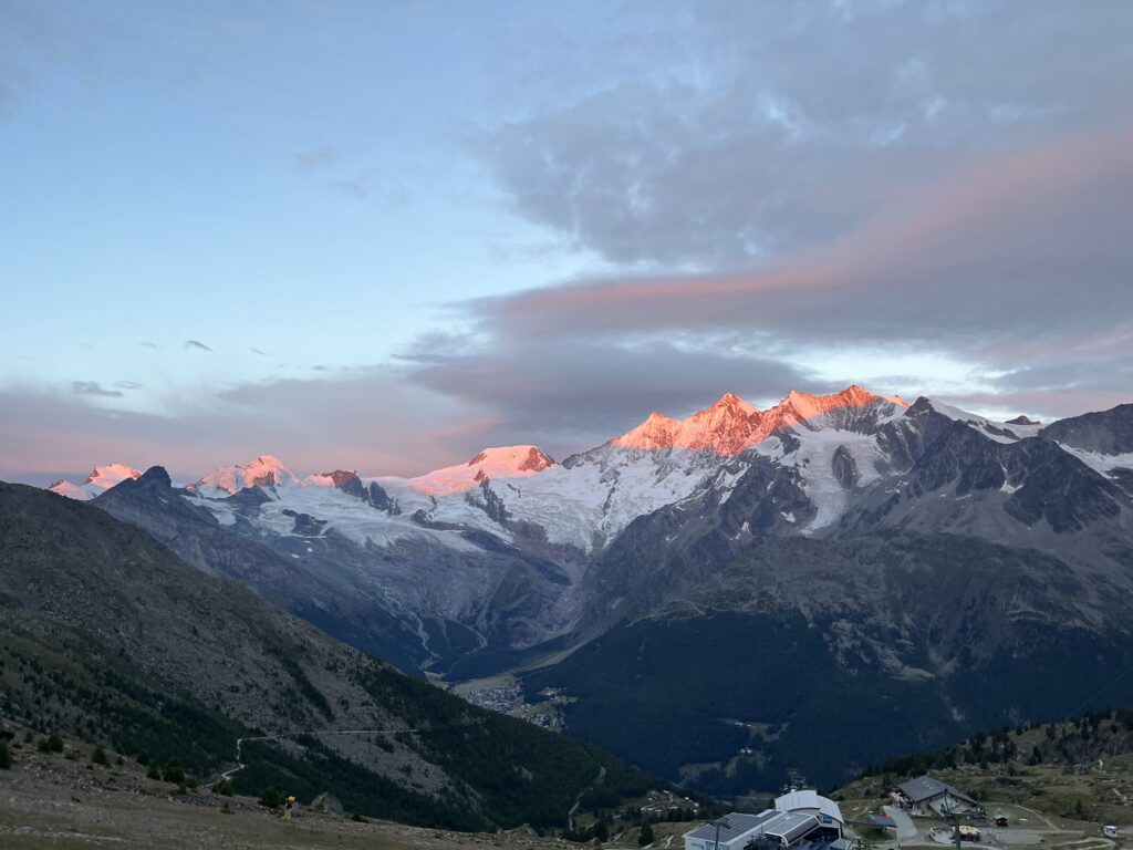 Die Wahl fiel auf das Lagginhorn 4010m. Der Anstieg ist angenehm, gletscherfrei und wenig exponiert, bietet aber dennoch das volle Hochtouren-Feeling. Das Highlight? Das Panorama ist schlichtweg unschlagbar: Während des gesamten Aufstiegs thronen die Giganten der Mischabelgruppe – vom Dom bis zum Allalinhorn – direkt gegenüber.